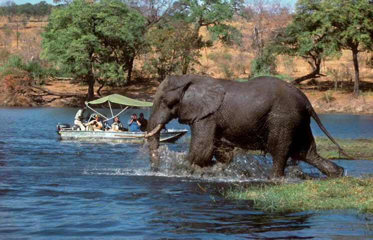 Leaving the Okavango ecosystem, we get a bird’s-eye view of the Delta as we fly by private charter to the southern section of Chobe National Park, where we explore the Savuti River Area, a vast grassland that attracts migrating herds of herbivores. This is one of the best places to find lions, leopards, and other predators and their prey—large herds of giraffe, kudu, vervet monkey, and baboon. At night, Chobe comes to life with the whooping calls of wild dogs and the rumbles of elephants, and if the skies are clear, it’s easy to see the Southern Cross. From our mobile camp in the Serondella area, with its photogenic baobab trees, we’ll take a private cruise on the Chobe River to see big herds of tuskers ambling down to the river at sunset.