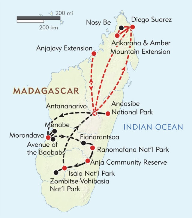 From “Tana,” the capital, we head to Andasibe-Mantadia National Park, a rainforest reserve created to protect the indri, the largest living lemur species, whose treetop calls carry for miles. Common brown, grey bamboo, and woolly lemurs are also found here. We’ll visit Lemur Island, a sanctuary for orphaned lemurs—the lemurs here are habituated to people, allowing great photo opportunities.