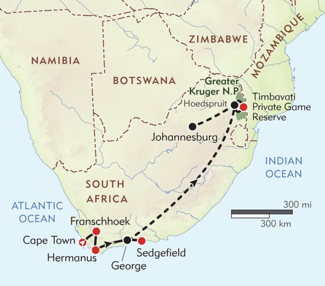 From the spectacular Garden Route along the turquoise Indian Ocean to the Big Five savannas of Greater Kruger, this journey weaves all the marvels of South Africa into one perfect adventure. We’ll explore the Cape of Good Hope, with its Cape floral kingdom and rare penguins, ferry out to Robben Island, where Nelson Mandela spent 19 of his 27 years as a political prisoner, and sip wine at 17th century Cape Dutch wineries. On the Garden Route, we look for the “Marine Big Five,” including southern right whales, go kayaking in Knysna Lagoon, and take an intertidal moonlight meander with a marine biologist in search of bioluminescence. We finish up in style with an epic Big Five safari on exclusive private game lands in Greater Kruger.