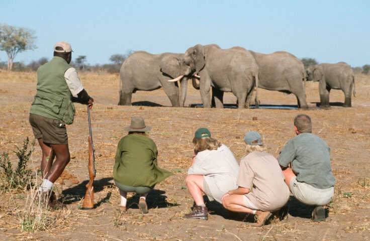 Wake up to birdsong and set out on a variety of adventures. Early risers may enjoy an optional morning game walk, a great way to experience Hwange on foot and see the small details of the bush, such as birds’ nests and game tracks. Or you can enjoy a morning or afternoon game drive (or a full-day game drive) in our shared open-air vehicles. Elephant, giraffe, zebra, wildebeest, and impala are often seen in these parts, making for an exhilarating day in the bush. June to October is the dry season and wildlife frequents the waterholes, enhancing game viewing opportunities. Enjoy a picnic lunch overlooking the Mfagazaan Pan and watch as the animals make their way across the dry plains for a drink of fresh water. A leisurely afternoon drive from pan to pan brings you back to the lodge, weaving your way between throngs of elephants. You also have the option of a morning or afternoon visit to walk with white rhinos at the newly created Ngamo Rhino Sanctuary. This thrilling experience grants us special access to see some of the first white rhinos reintroduced to this region of Zimbabwe—learn about this unique project to create a safe haven for one of Africa’s most endangered large animals. Late afternoons often include the safari tradition of “sundowner” drinks in a beautiful location at sunset. And, after dinner at the lodge, enjoy a nightcap by the campfire, sharing stories and photos of the day’s excursions. Overnight at lodge...BLD