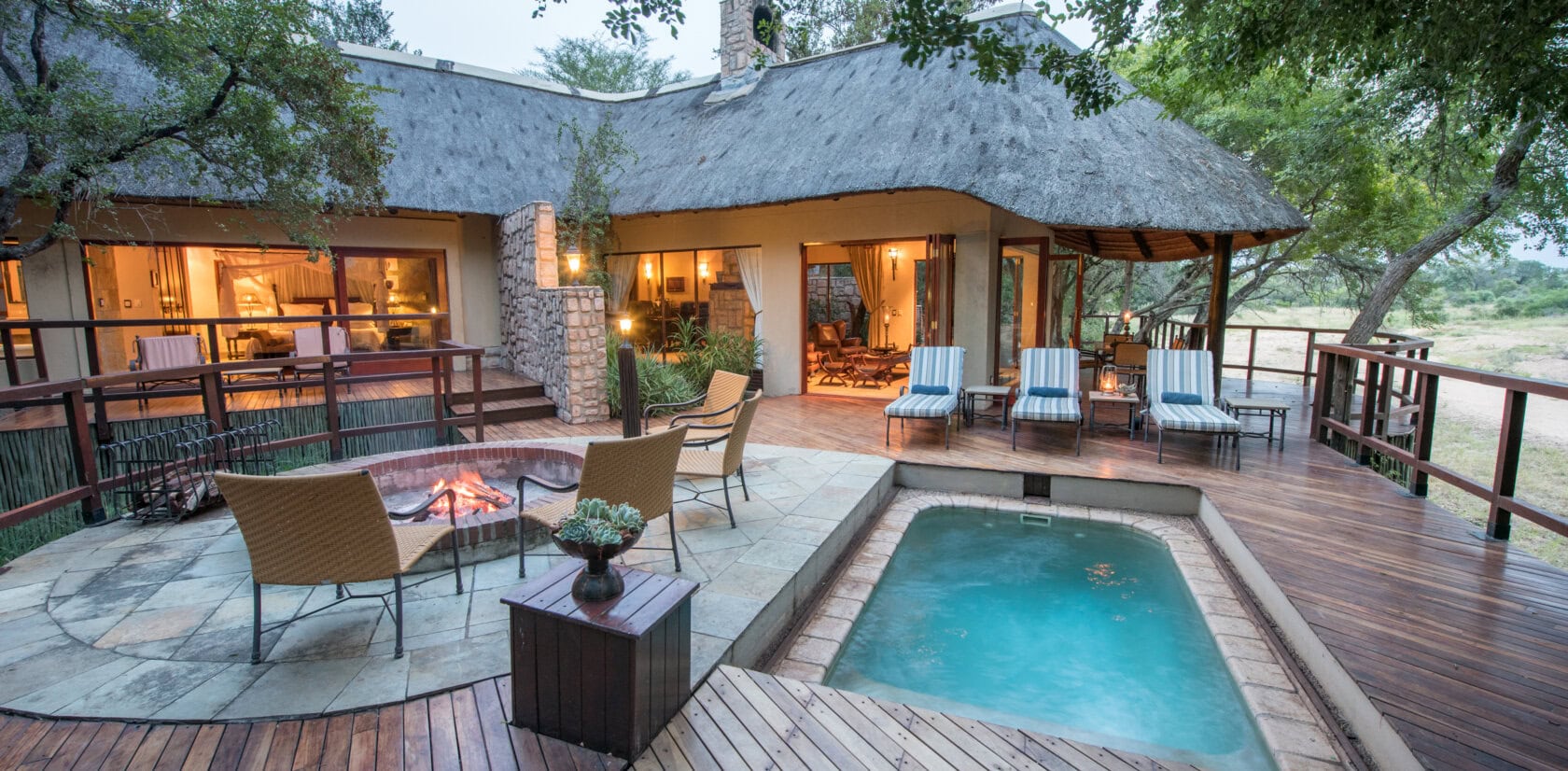 A stay at Shumbalala Game Lodge, in the Thornybush Reserve bordering Kruger National Park, South Africa, is an ideal way to experience additional game viewing while enjoying the amenities of a deluxe wildlife lodge. Set on the banks of the Monwana River, Shumbalala is an oasis of luxurious comfort in the heart of the African bushveld. Activities include morning and late afternoon game drives in search of the Big Five, bush walks in the company of an expert ranger and tracker, or simply relaxing on decks overlooking a waterhole where animals frequently congregate. The lodge caters to a maximum of eight guests in four suites, each with its own fireplace and spacious bathroom with indoor and outdoor showers.