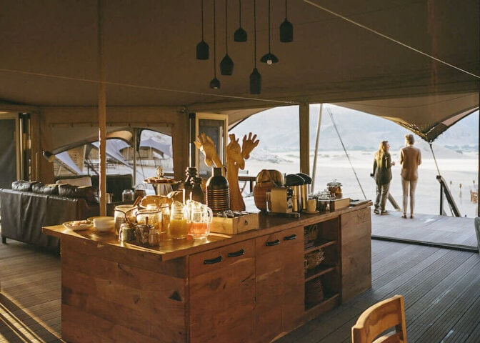 Our morning drive will more often than not reveal desert-adapted elephant, as well as stately desert-adapted giraffe, and, if we're very lucky, desert lion. Zebra, klipspringer, and kudu move freely through the mountains, and we'll find hardy herds of springbok and oryx as well as steenbok picking their way across the dust-blown landscapes. Bird watchers, keep your eyes peeled for Monteiro's hornbills or Ruppell's korhaans in the valleys and the imperious Verreaux's eagle in the mountains. After a full morning of exploring this remarkable area, we head back to camp for some well-deserved down time. The afternoon will include a scenic walk or a sundowner drive. Overnight at Hoanib Valley Camp...BLD