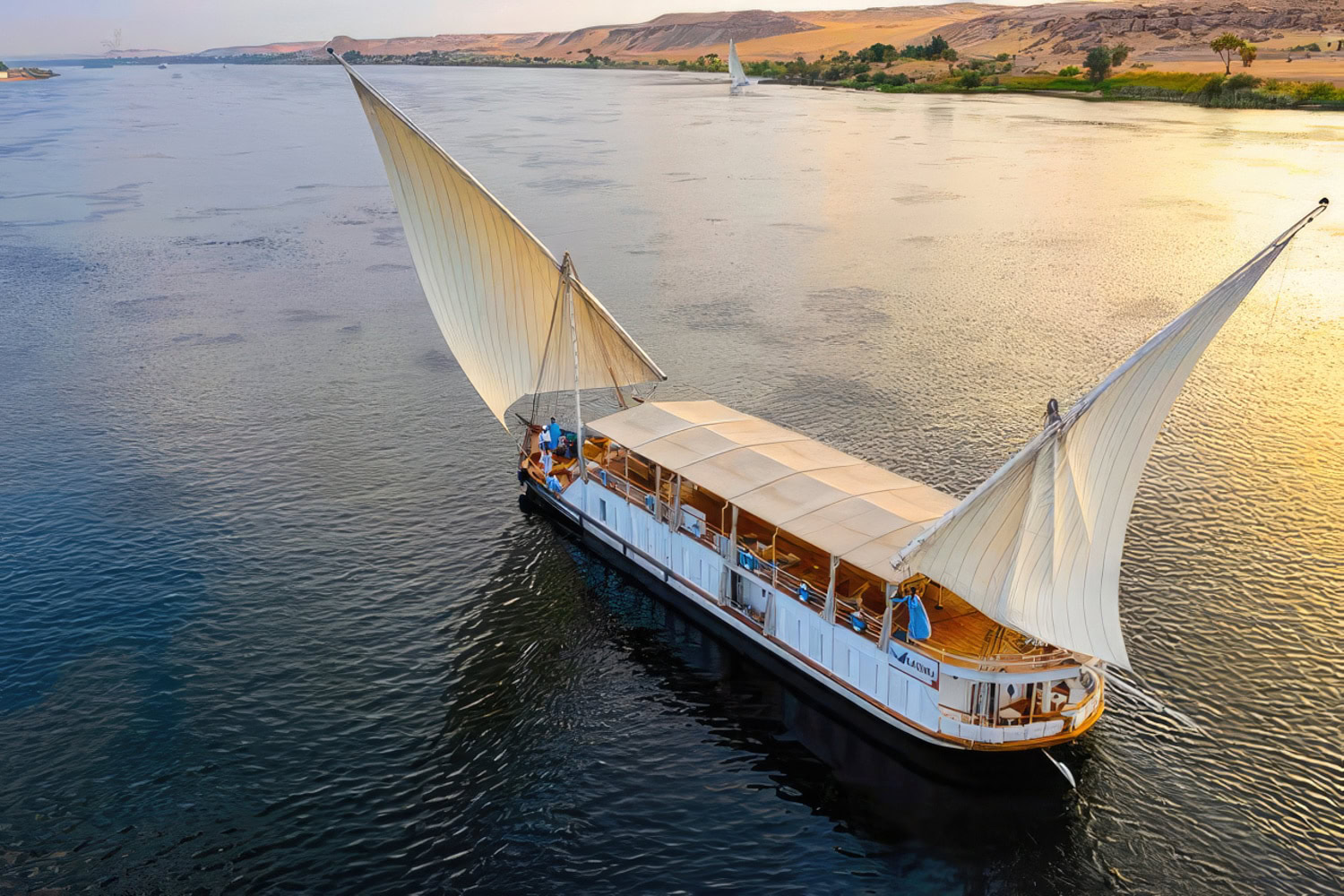 Our home base for five nights is the 100-foot dahabiya L'Orient, a traditional Nile sailboat built at the end of the 19th century and completely refitted in 2003. She is air conditioned and has two decks and four double or twin cabins and one suite with private baths. The L'Orient is sail-powered only, but will use motor-boat assistance in cases of low wind. Public spaces on L'Orient include an interior lounge and a large shaded deck where meals are served. There are electrical outlets in the cabins for charging batteries. (You will need a voltage converter and plug adapter). Meals are on board the L'Orient. Bottled water is available on board as well as tea and coffee. A selection of imported wine and beer is available for purchase. There is no corkage fee for trip members who bring their own.