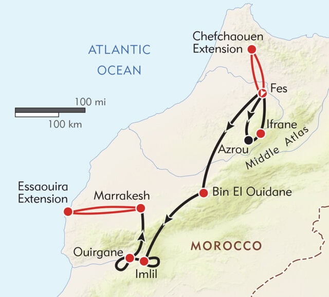 Hike by day, then enjoy a glass of wine, a fine dinner, and a cozy bed each night! This unique journey features fantastic hiking days in the most beautiful parts of the Middle Atlas and High Atlas mountains and overnights in alpine-style lodges and hotels—no camping! We've selected special routes in both mountain ranges for fascinating cultural encounters and an opportunity to hike in nature reserves where rare forests of cedar, oak, and juniper are protected. Our trails lead through orchards and farms, among goat herders and their flocks, and past mud-brick homes in Berber villages. We'll round out our adventure with urban walks in Fes and Marrakesh, with time to explore their unforgettable markets and monuments.