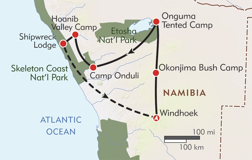 Namibia is one of the most hauntingly beautiful safari destinations in the world, brimming with astounding landscapes and rare species found nowhere else. We discover this epic land during the “green season” (January to March) as we track leopards at AfriCat and explore World Heritage-listed Etosha National Park from its less-traveled eastern gate. Heading into Namibia's far northwest, we search for desert-adapted elephants in ethereal Damaraland, then discover Kaokoland's remote Hoanib River Valley, which teems with resident desert-adapted wildlife in a vast, mountainous, and wild landscape. We'll visit a Himba settlement while we're in this luminous land and learn about their nomadic culture. Our grand finale finds us at Shipwreck Lodge, perched right on the dunes of the legendary Skeleton Coast. We enjoy all this with an expert Trip Leader who is one of Namibia's best known naturalist guides. The green season is Namibia's summer, a time of bounty, bringing the desert to life to reveal carpets of buttercup-yellow devil's-thorn flowers and swaths of yellow and pink cleomes. It is calving season for plains game such as springbok and zebra, peak birdwatching season for flocks of migratory species, and an ideal season for photography, with clear, dust-free skies and striking cloud formations. Rain is usually confined to a short and spectacular daily afternoon thundershower, which brings the plains alive with new green grass. To top it off, our journey comes at a savings of more than $1,500 per person compared with high-season safaris. Join us to explore the very best places to be during this special season!