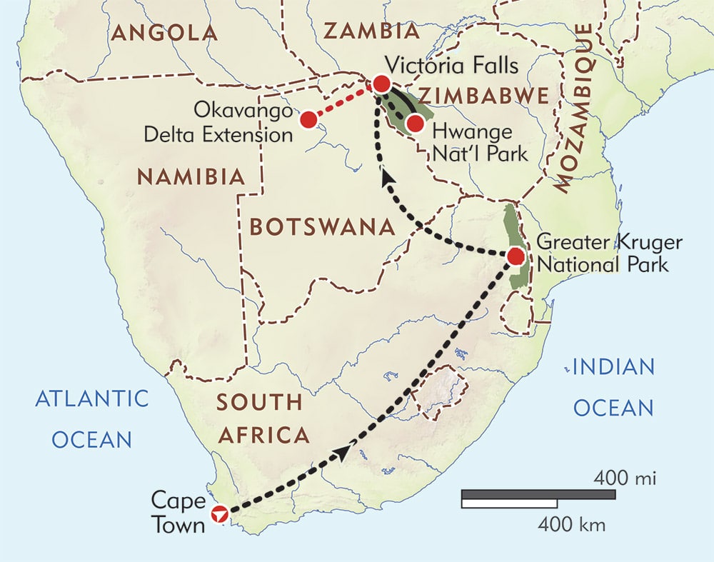 Explore the rich culture of South Africa's Cape Town, the lush landscapes of Victoria Falls, and the astounding diversity of Greater Kruger and Hwange National Park on this private journey. Begin in colorful Cape Town with its rocky peaks, world-renowned wineries, and striking Cape Dutch architecture. Venture to an exclusive private game reserve in Greater Kruger for the ultimate in game-viewing and the chance to encounter leopard, lion, elephant, rhino, and buffalo. In Victoria Falls, walk along trails beneath the roaring thunder where optional activities include a helicopter trip over the falls and bungee jumping. Enter Hwange National Park on the Elephant Express rail car and savor some of the most incredible walking safaris in all of Africa, along with lantern-lit dinners and an optional visit to a nearby village and local school.