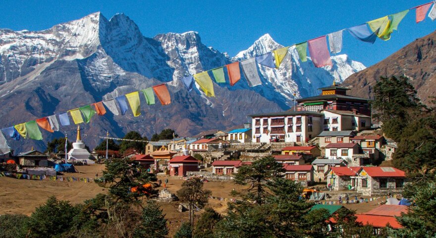 Fly to the airstrip at Lukla (9,350'), gateway to Everest, and hike to Namche Bazaar, the Sherpa trading center. Continue farther up the Khumbu Valley to the twin villages of Khunde and Khumjung, then to the ridgetop site of Tengboche Monastery (12,650'), spiritual center of the Sherpa people. Our visits to their villages are a wonderful introduction to Sherpa culture.