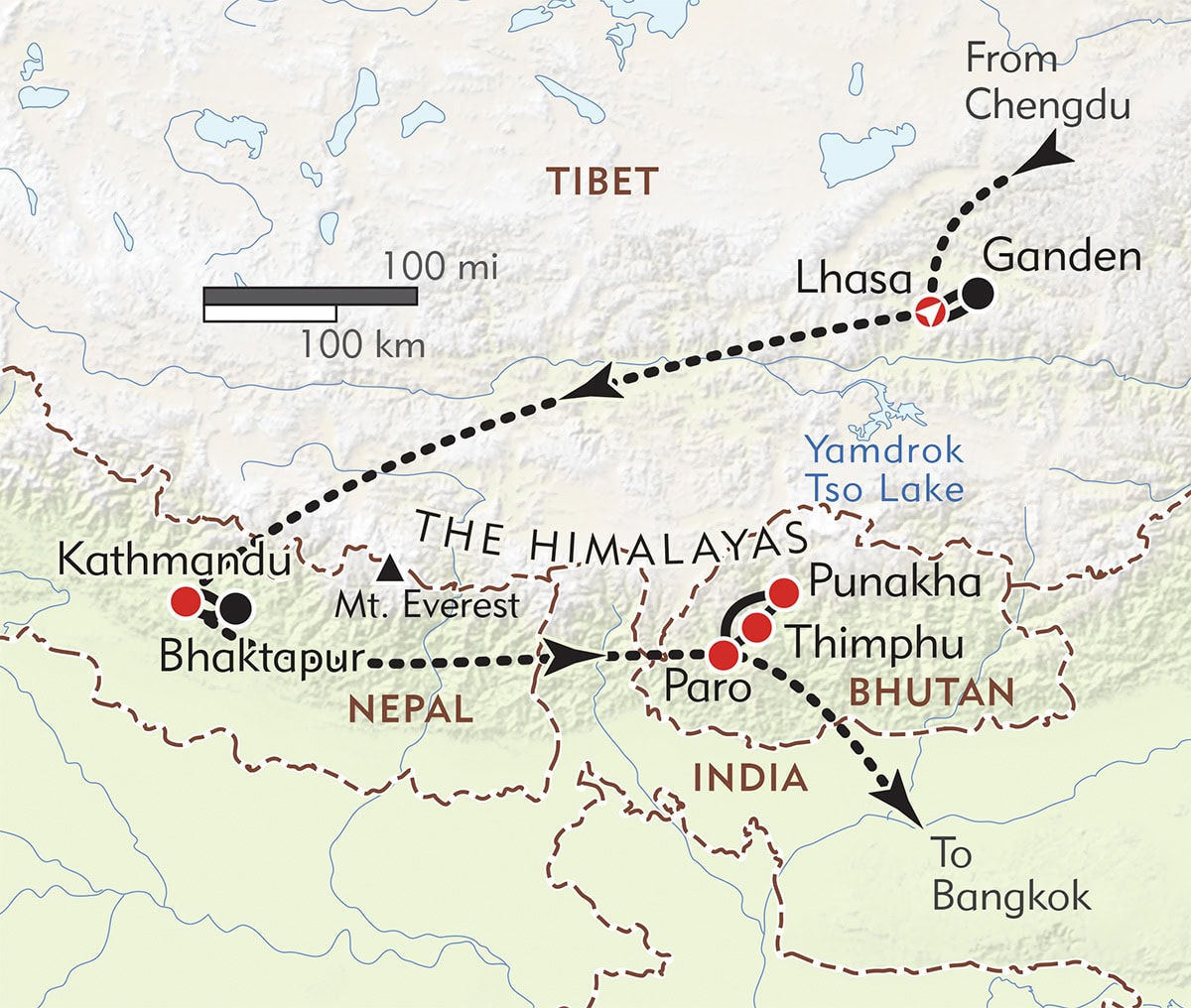 • Experience the best of three unique but culturally interconnected Himalayan mountain kingdoms: Tibet, Nepal, and Bhutan