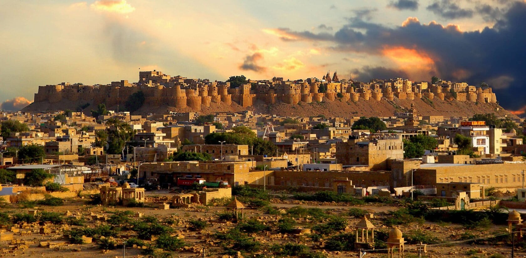 The origins of Jaisalmer go back to the 12th century when Rawal Jaisal, a Rajput chieftain of the Yadav clan, abandoned his old fort at Lodurva and laid the foundation of a new city on a triple-peaked rock. The Golden Fort and its inner citadel crown the 80-meter-high hill and are approached through the Sun Gate. Within the fort is a seven-story palace with its Megh Durbar, or Hall of Clouds. Also in the inner enclosure is a group of finely carved Jain temples that date from the 12th to the 15th centuries. The glory of Jaisalmer faded when sea trade replaced the old land routes, but an “Arabian Nights” quality remains in Jaisalmer's streets and marketplaces. The narrow streets of the walled city preserve a traditional way of life as craftsmen still work in ancient arts, including stone carving and silver jewelry.