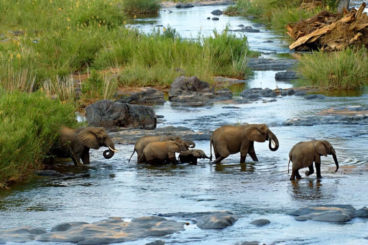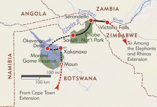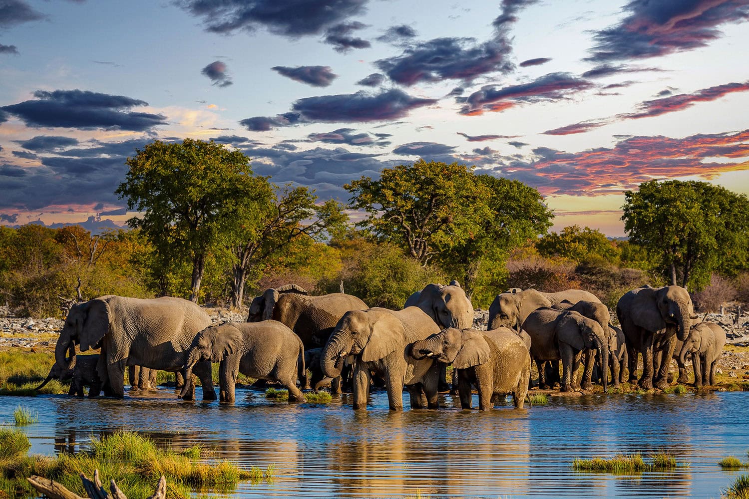 Leaving the Okavango ecosystem, we get a bird’s-eye view of the Delta as we fly by private charter to the southern section of Chobe National Park, where we explore the Savuti River Area, a vast grassland that attracts migrating herds of herbivores. This is one of the best places to find lions, leopards, and other predators and their prey—large herds of giraffe, kudu, vervet monkey, and baboon. At night, Chobe comes to life with the whooping calls of wild dogs and the rumbles of elephants, and if the skies are clear, it’s easy to see the Southern Cross. From our mobile camp in the Serondella area, with its photogenic baobab trees, we’ll take a private cruise on the Chobe River to see big herds of tuskers ambling down to the river at sunset.