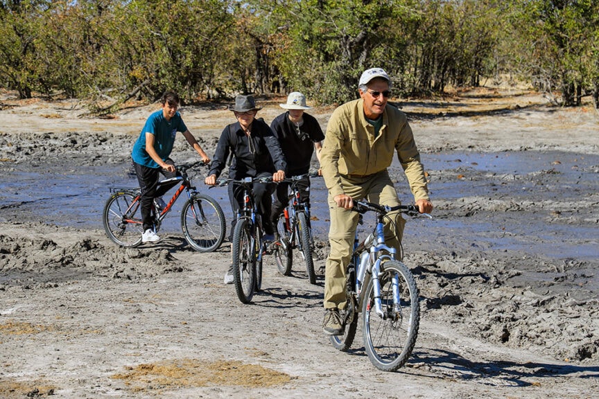 After a short bush flight (my sons loved this and got to sit in the cockpit with the pilot!), we arrived at Jozibanini, our most remote camp, located amid ancient windblown fossil sand dunes separated by shallow valleys. We slept in cozy, comfortable beds outside under the stars, and ate delicious meals cooked over a campfire in the evenings, while the days were full of excitement. We road mountain bikes and had lunch with elephants, and got to experience the “toe nail” view of several large elephant herds. We observed their fascinating behavior and interactions from inside the special blind constructed right next to camp, made out of a shipping container sunk into the ground, complete with cushion seats and a bathroom.