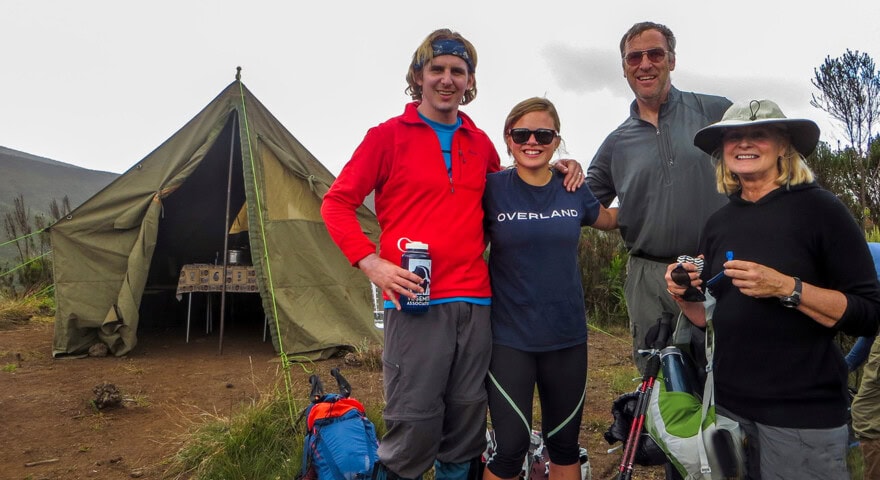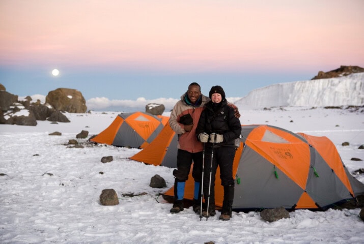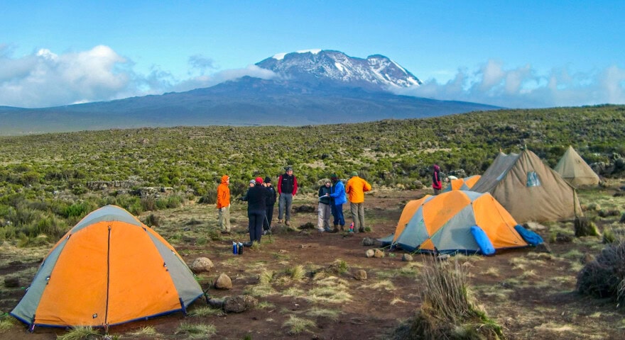 On the Kilimanjaro climb, porters carry the group gear and you carry a daypack for your wind/rain jacket, water bottle, and camera (depending on your equipment, this can weigh approximately 10 pounds). The camp crew sets up camp each day and we are served dinner in a dining tent with tables and chairs. We use American-made mountaineering tents rated by the manufacturer as 3-person tents but we use them for only two people, ensuring a fair amount of space for sleeping. Sleeping bags are rated to -30°F and sleeping pads are two inches thick and over two feet wide. Fires are not allowed on the mountain so there are no hot showers available at camps (hot showers are available at all of our safari camps).