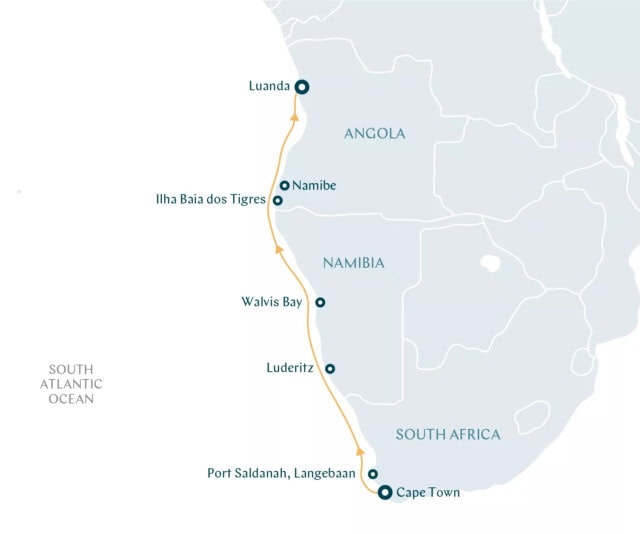 Now known as Moçâmedes, the port of Namibe was settled by the Portuguese in the 19th century. This early slave trading town is the entrance to the arid Namib desert, with towering sand dunes and home to the ancient welwitschia mirabilis trees, each over 2,000 years old and threatened by climate change. Near the port, the old town has colorful colonial architecture, beaches, and historic buildings, including an abandoned spaceship-like cinema. The following day is at sea.