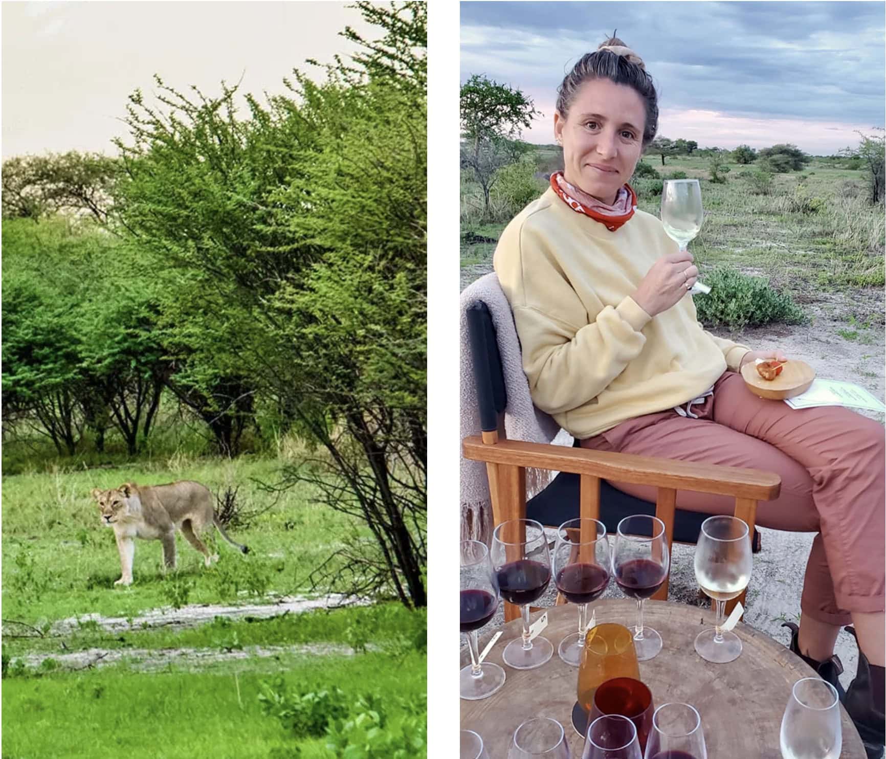 On our first game drive of the trip on the Onguma property, we came across a lioness stalking a giraffe. I’d seen the footage of lions hunting giraffe before, but I never imagined I would get to see it in person. She charged and ran off into the distance after the fleeing giraffe (who would not be dinner that night), and we continued five minutes up the road to our sundowner spot. Only six of those glasses are mine, in case you were wondering.