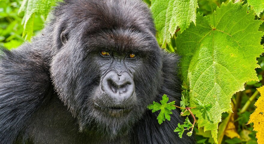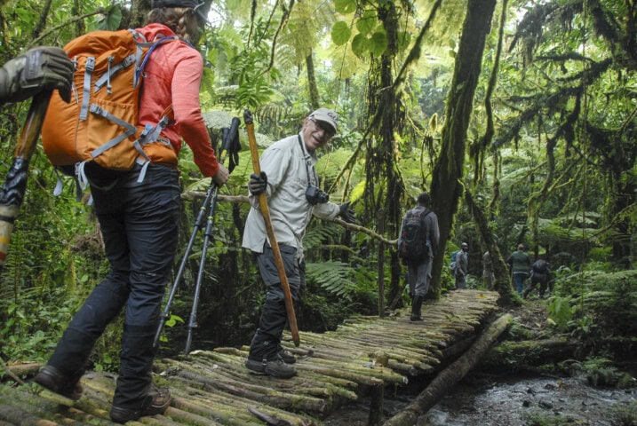 Altitudes for the gorilla tracking portions of the trip range from approximately 3,900 feet to approximately 7,500 feet. You will be hiking through dense, thorny bush covering up to four miles or more in distance. You may be hiking in all types of weather; rain can occur in these mountains at a moment's notice. The climate is hot and humid. We will often hike uphill to follow the clans, but will take breaks along the way. The hike to see the chimpanzees takes an average of 2.5 hours, though it can last up to 4 hours when chimps are on the move in search of food. We will hike on marked trails for at least part of the trek. However, as with the mountain gorillas, we will follow the chimps' movements, prompting us to sometimes go off-trail based on their wanderings. Altitudes during this portion of the trip range from approximately 3,900 feet to approximately 4,600 feet. Conditions can be boggy and since we are in a tropical rainforest, it can rain at any time.