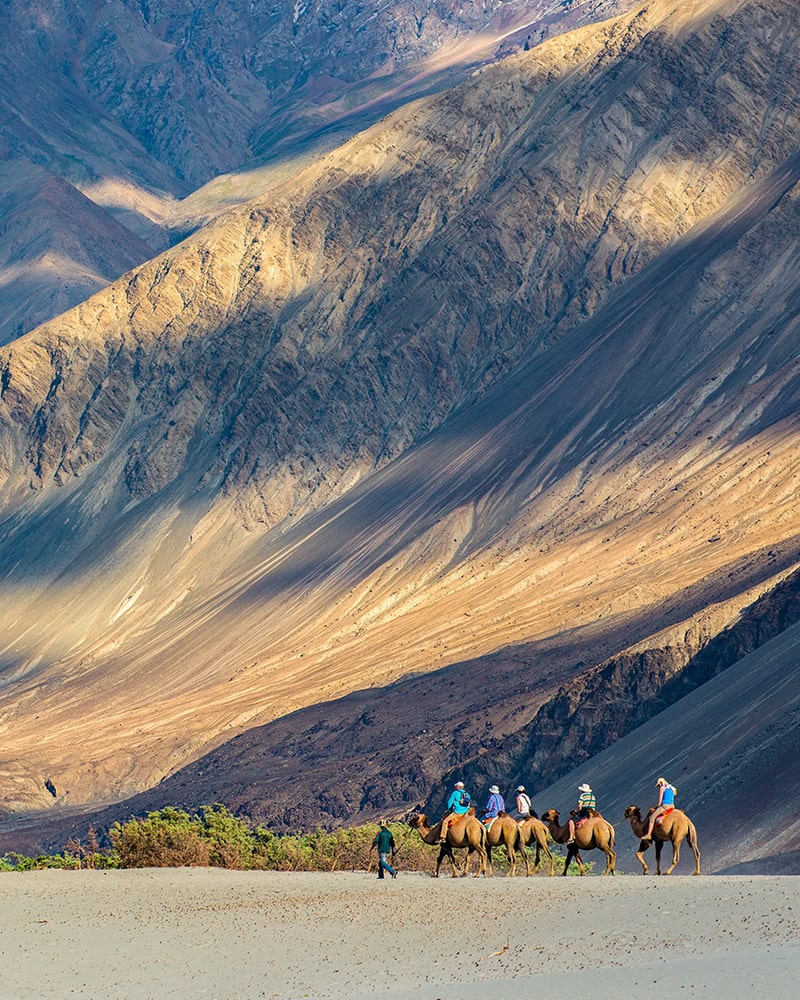 Drive to the remote Nubra Valley (10,340'), crossing the Wari La, a spectacular mountain pass at 17,300 feet. Explore the village of Panamik. visit Ensa Monastery,and hike through a peaceful valley surrounded by the impressive Karakorum Mountains.