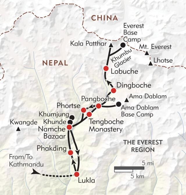 Fly to the airstrip at Lukla (9,350'), gateway to Everest, and hike to Namche Bazaar, the Sherpa trading center. Continue farther up the Khumbu Valley to the twin villages of Khunde and Khumjung, then to the ridgetop site of Tengboche Monastery (12,650'), spiritual center of the Sherpa people. Our visits to their villages are a wonderful introduction to Sherpa culture.