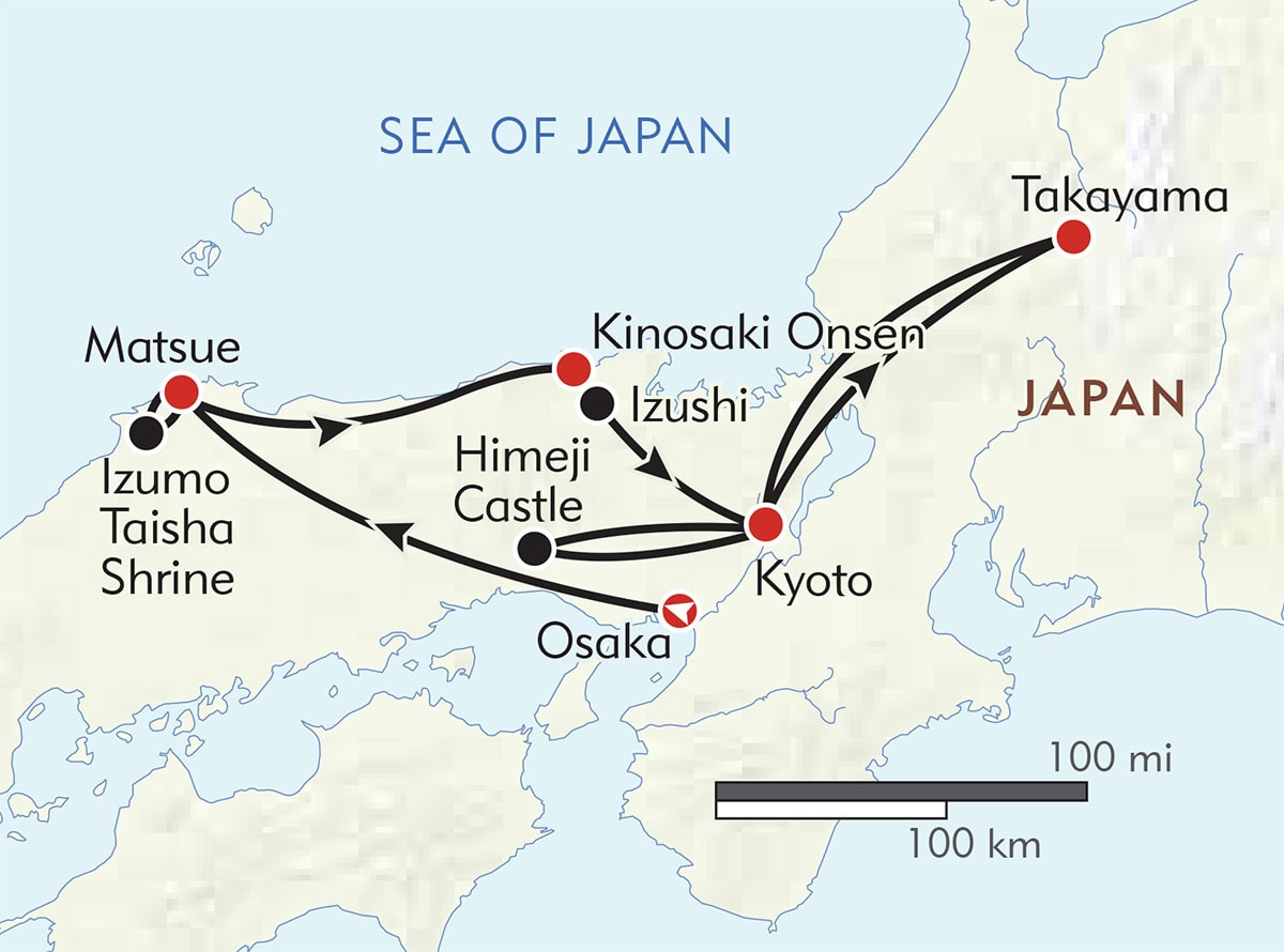 Our special journey reveals fascinating “insider” aspects of Japanese culture that travelers might not find on their own. We begin in Matsue on the northwest coast, exploring the city’s 400-year-old feudal castle and the elegant samurai houses encircling it. In the hidden gem of Kinosaki Onsen, a traditional hot springs town filled with the culture of old Japan, we soak in classic hot springs and savor fresh-caught seafood. We’ll walk the storied lanes of Kyoto, seeking off-the-beaten-path temples and gardens, with a grand finale in Takayama in the Japanese Alps, where we’ll join in the fun of a seasonal festival, celebrating the arrival of cherry blossoms in spring and the colorful fall foliage in autumn. Artisan visits, onsen baths, culinary treats, and the warm hospitality of the Japanese welcome us at every turn.