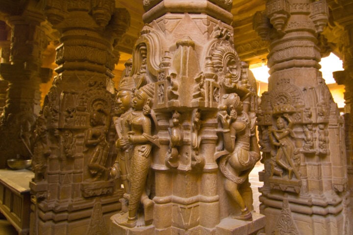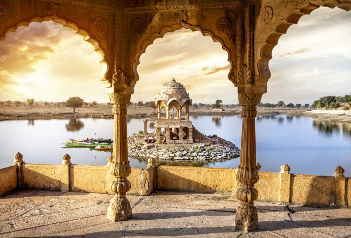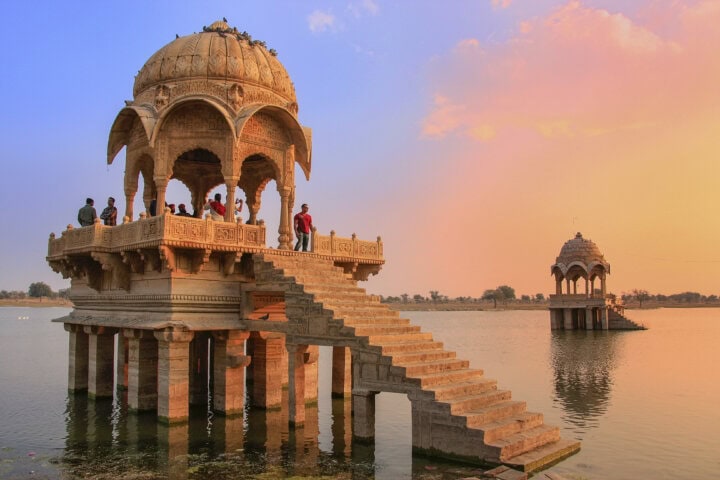 The origins of Jaisalmer go back to the 12th century when Rawal Jaisal, a Rajput chieftain of the Yadav clan, abandoned his old fort at Lodurva and laid the foundation of a new city on a triple-peaked rock. The Golden Fort and its inner citadel crown the 80-meter-high hill and are approached through the Sun Gate. Within the fort is a seven-story palace with its Megh Durbar, or Hall of Clouds. Also in the inner enclosure is a group of finely carved Jain temples that date from the 12th to the 15th centuries. The glory of Jaisalmer faded when sea trade replaced the old land routes, but an “Arabian Nights” quality remains in Jaisalmer's streets and marketplaces. The narrow streets of the walled city preserve a traditional way of life as craftsmen still work in ancient arts, including stone carving and silver jewelry.